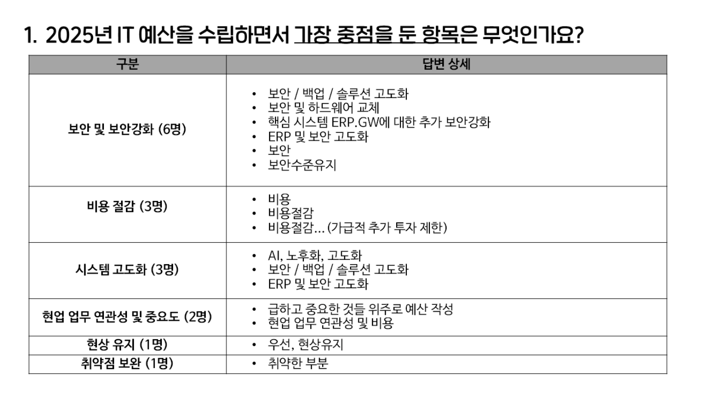 - 2025년 IT 예산을 수립하면서 가장 중점을 둔 투자 항목, 상대적으로 줄이거나 보류한 항목은 무엇인가요?
