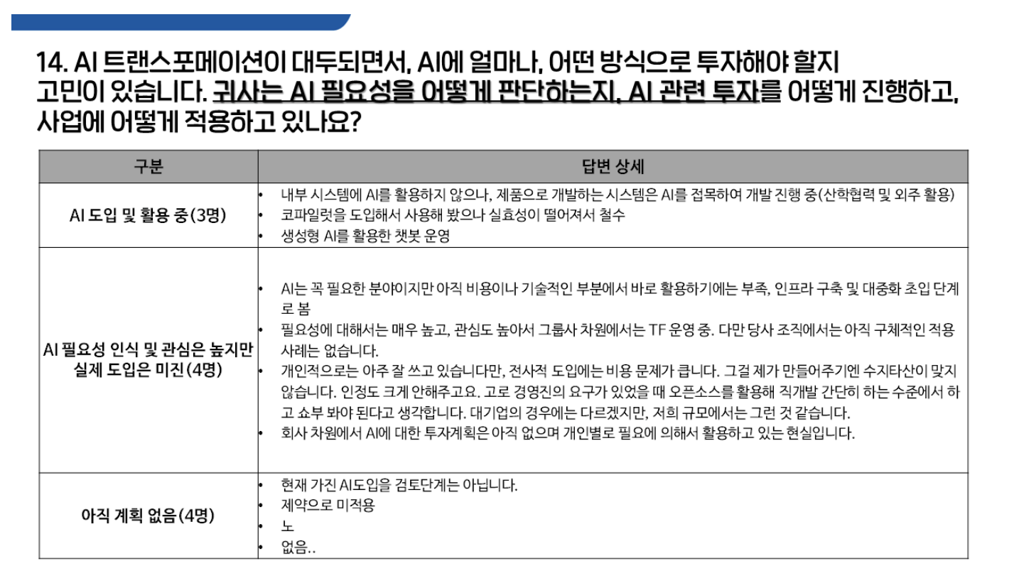 올해 빠질 수 없는 키워드인 AI와 관련된 질문에 대한 답변도 이어졌습니다. 사전 설문 응답자 중 약 36%가 AI의 필요성을 인식하고 있고 관심은 높지만 실제 도입은 미진하다고 답변해 주셨습니다. 아직 큰 계획이 없는 비중도 동일했으며, 약 27%의 응답자만이 사내에 AI 시스템을 도입해 활용하고 있다고 답변해 주셨어요.