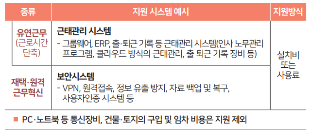 - 유연근무를 활용하고 근무 혁신을 만들어 가고자 하는 중소 및 중견기업 사업주라면 지원대상에 포함돼요.