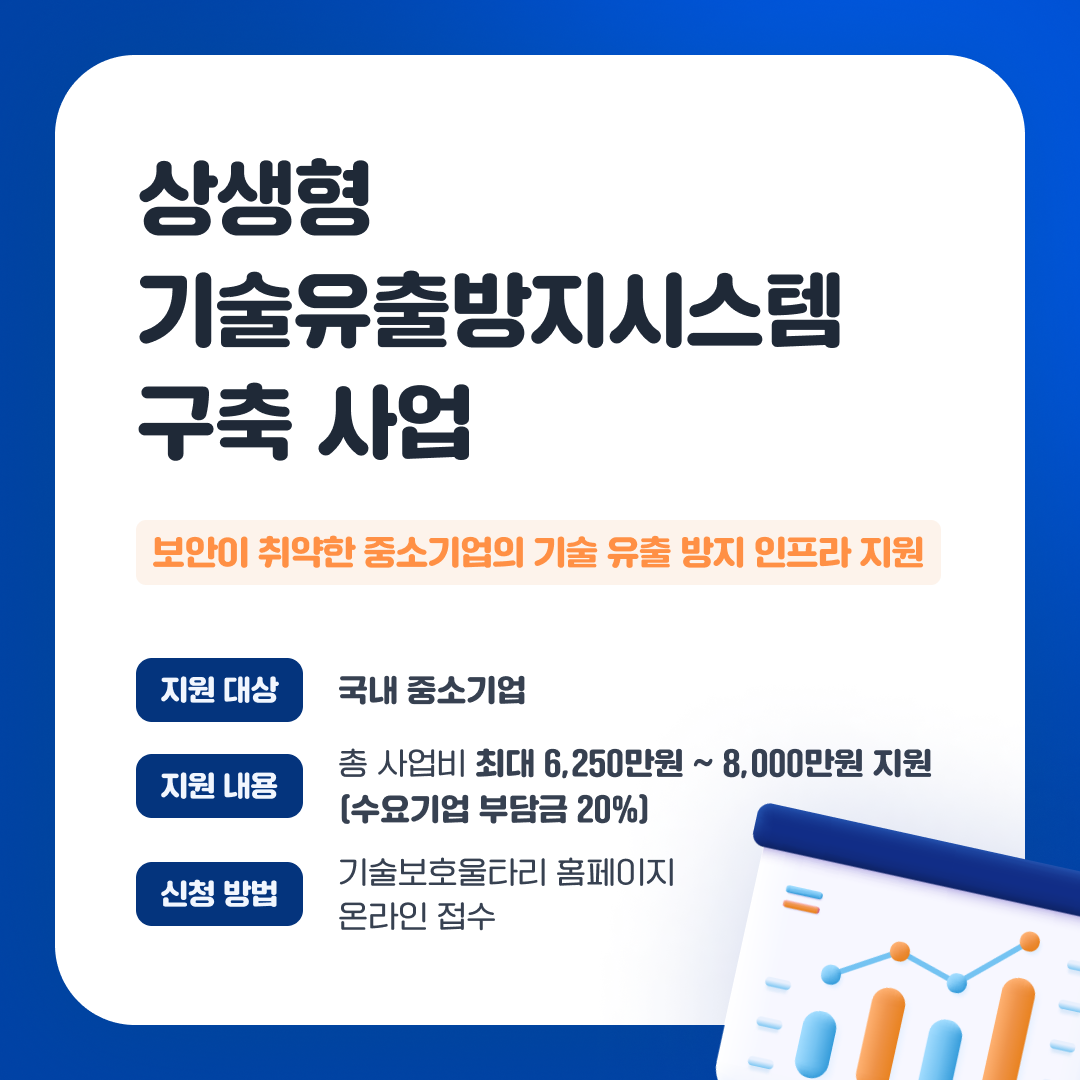 - 기존의 기술유출방지시스템 구축 사업과 내용은 동일하지만, 공공기관과 대기업의 상생협력기금을 지원받을 수 있다는 점이 특징적이에요.