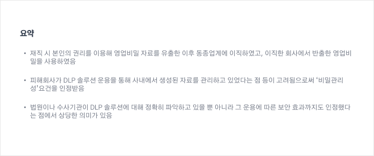 법원은 '비밀관리성' 요건 판단 시 피해 회사가 외부저장장치를 통한 자료 유출을 방지하는 보안프로그램 DLP 솔루션 운용을 통해 사내에서