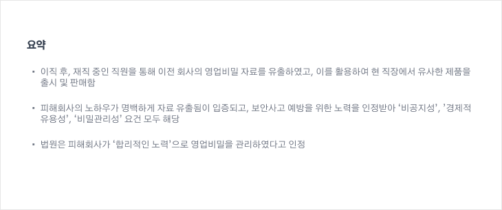 앞서 말씀드렸던 것처럼 보안대책을 통해 100%의 보안사고를 예방할 수는 없습니다. 하지만 보안사고 예방을 위한 활동으로 인해 다소 어렵지 않게 ‘비공지성’, ’경제적 유용성’, ‘비밀관리성’ 요건을 만족하여 영업비밀에 해당한다는 판단을 받을 수 있었습니다.