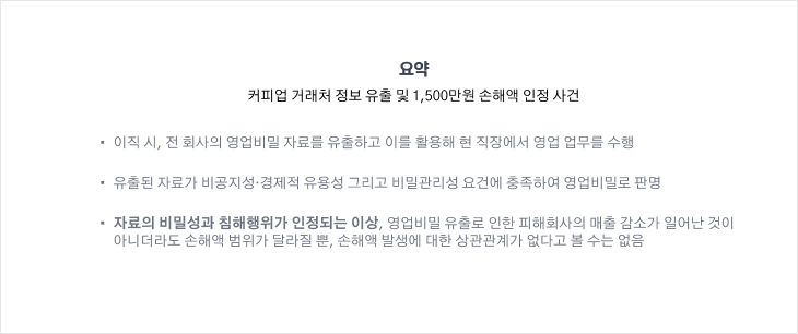 지금까지 이직을 통한 정보유출과 유출 사고로 인한 손해액을 인정한 사례를 살펴봤는데요.