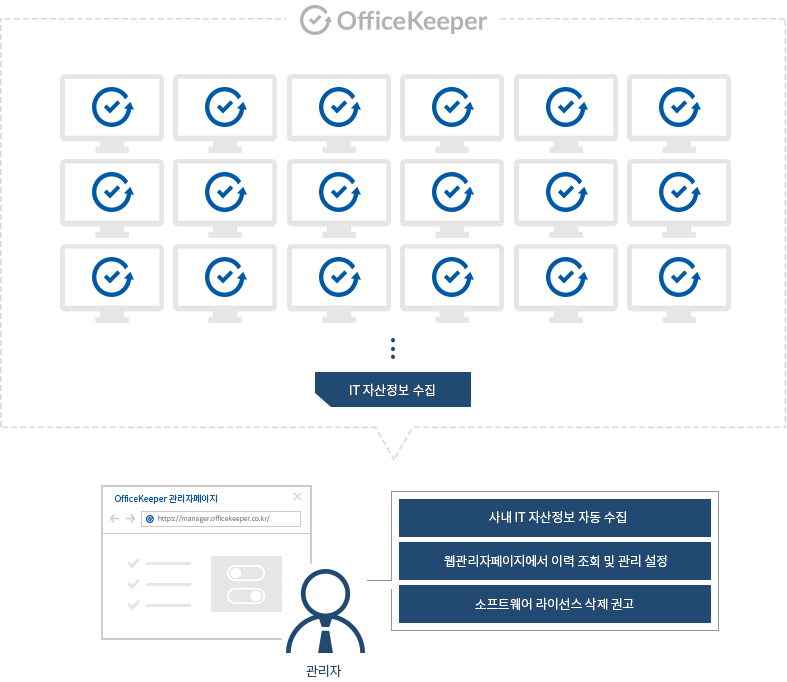 H/W, S/W 수량관리는 물론, 노트북 반출현황 관리와 컴퓨터 절전 중앙관리까지 다양한 관리 기능을 활용해 관리자의 업무 효율성을 높일 수 있습니다